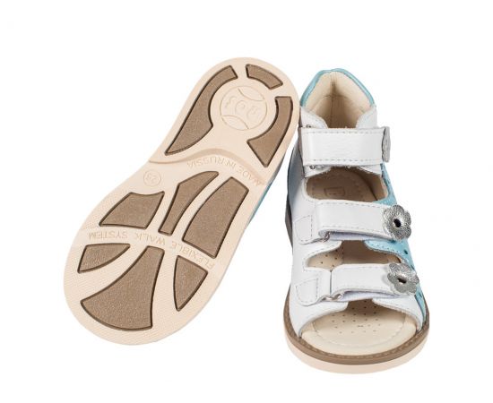 Ортопедические сандалии для профилактики и коррекции плоскостопия и плосковальгусной установки стоп. Широкий, устойчивый каблук специальной конфигурации - каблук Томаса. Каблук продлен с внутренней стороны до середины стопы, чтобы исключить заваливание стопы вовнутрь, так называемая косолапость, или вальгусная деформация. Анатомическая стелька с супинатором для правильного формирования свода стопы. Задник максимальной жесткости с удлиненным крылом надежно стабилизирует голеностопный сустав во время ходьбы. Упругая, умеренно-эластичная подошва, имеющая перекат, позволяет повторить естественное движение стопы при ходьбе для правильного распределения нагрузки на опорно-двигательный аппарат ребенка.