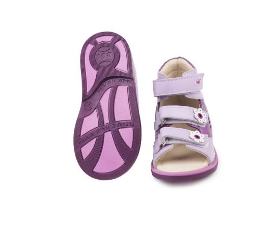 Ортопедические сандалии для профилактики и коррекции плоскостопия и плоско-вальгусной установки стоп. Широкий, устойчивый каблук специальной конфигурации - каблук Томаса. Каблук продлен с внутренней стороны до середины стопы, чтобы исключить заваливание стопы вовнутрь, так называемая косолапость, или вальгусная деформация. Анатомическая стелька с супинатором для правильного формирования свода стопы. Задник максимальной жесткости с удлиненным крылом надежно стабилизирует голеностопный сустав во время ходьбы. Упругая, умеренно-эластичная подошва, имеющая перекат, позволяет повторить естественное движение стопы при ходьбе для правильного распределения нагрузки на опорно-двигательный аппарат ребенка.