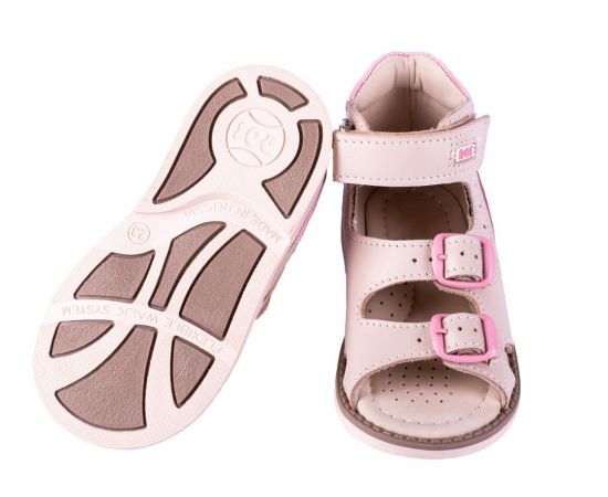 Профилактические сандалии для девочек поможет для коррекции плоскостопия и плоско-вальгусной установки стоп. Широкий, устойчивый каблук специальной конфигурации - каблук Томаса. Каблук продлен с внутренней стороны до середины стопы, чтобы исключить заваливание стопы вовнутрь, так называемая косолапость, или вальгусная деформация. Анатомическая стелька с супинатором для правильного формирования свода стопы. Задник максимальной жесткости с удлиненным крылом надежно стабилизирует голеностопный сустав во время ходьбы. Упругая, умеренно-эластичная подошва, имеющая перекат, позволяет повторить естественное движение стопы при ходьбе для правильного распределения нагрузки на опорно-двигательный аппарат ребенка.