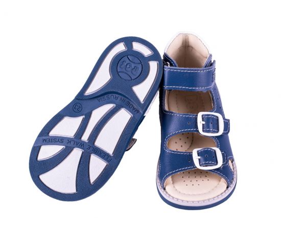 Сандалии для профилактики плоскостопия и плоско-вальгусной установки стоп. Широкий, устойчивый каблук специальной конфигурации - каблук Томаса. Каблук продлен с внутренней стороны до середины стопы, чтобы исключить заваливание стопы вовнутрь, так называемая косолапость, или вальгусная деформация. Анатомическая стелька с супинатором для правильного формирования свода стопы. Задник максимальной жесткости с удлиненным крылом надежно стабилизирует голеностопный сустав во время ходьбы. Упругая, умеренно-эластичная подошва, имеющая перекат, позволяет повторить естественное движение стопы при ходьбе для правильного распределения нагрузки на опорно-двигательный аппарат ребенка.