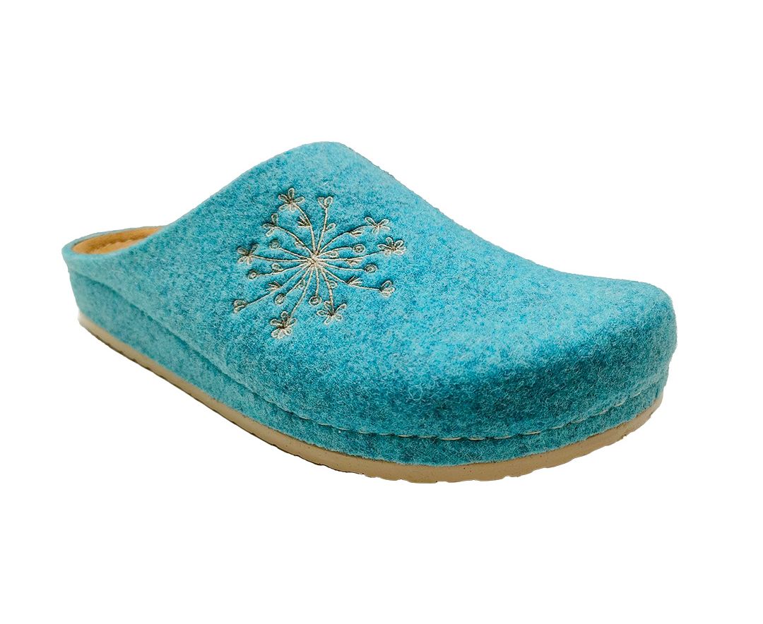 Яркие бирюзовые тапочки со снежинкой - это тепло, комфорт и уют для ваших ног. Приятная пружинящая анатомическая стелька встроена в обувь, покрытие - натуральная кожа.